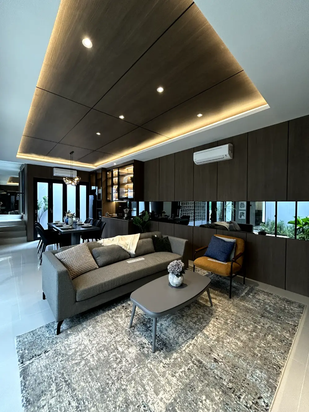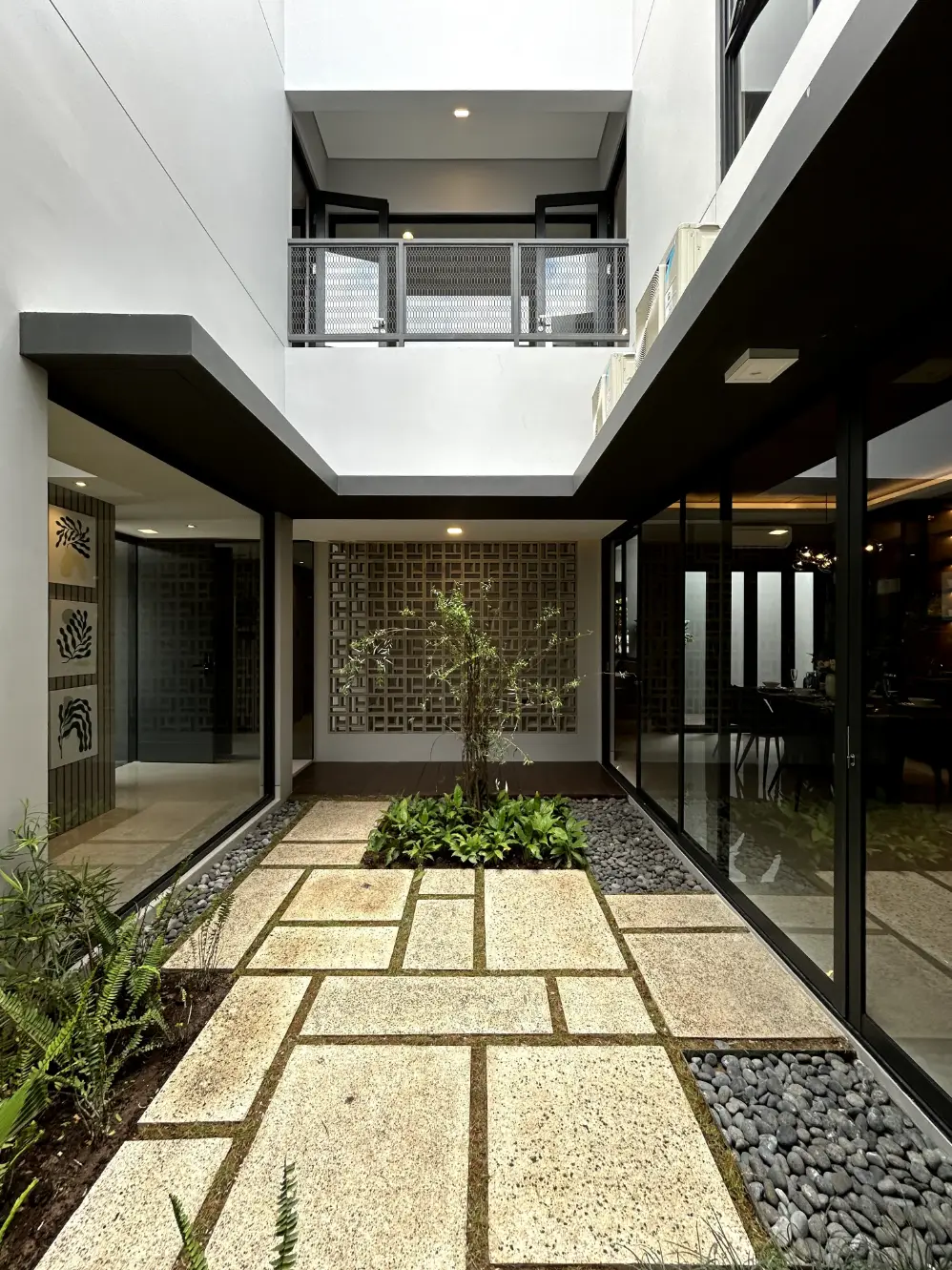 Lantai 1 dirancang untuk aktivitas harian dengan area living & dining room yang luas, kamar tidur tamu, kamar mandi, dan area servis yang terhubung ke halaman belakang.
