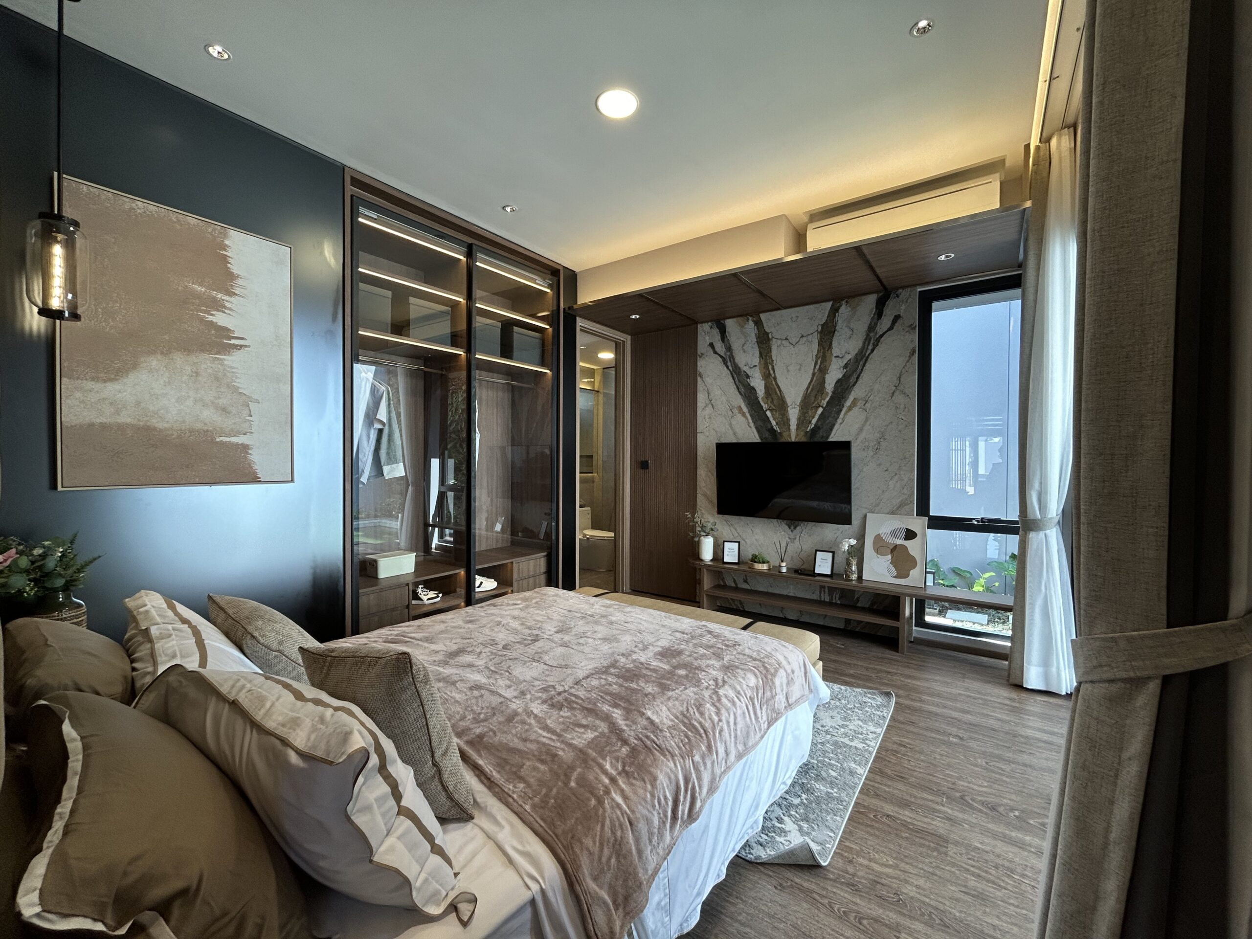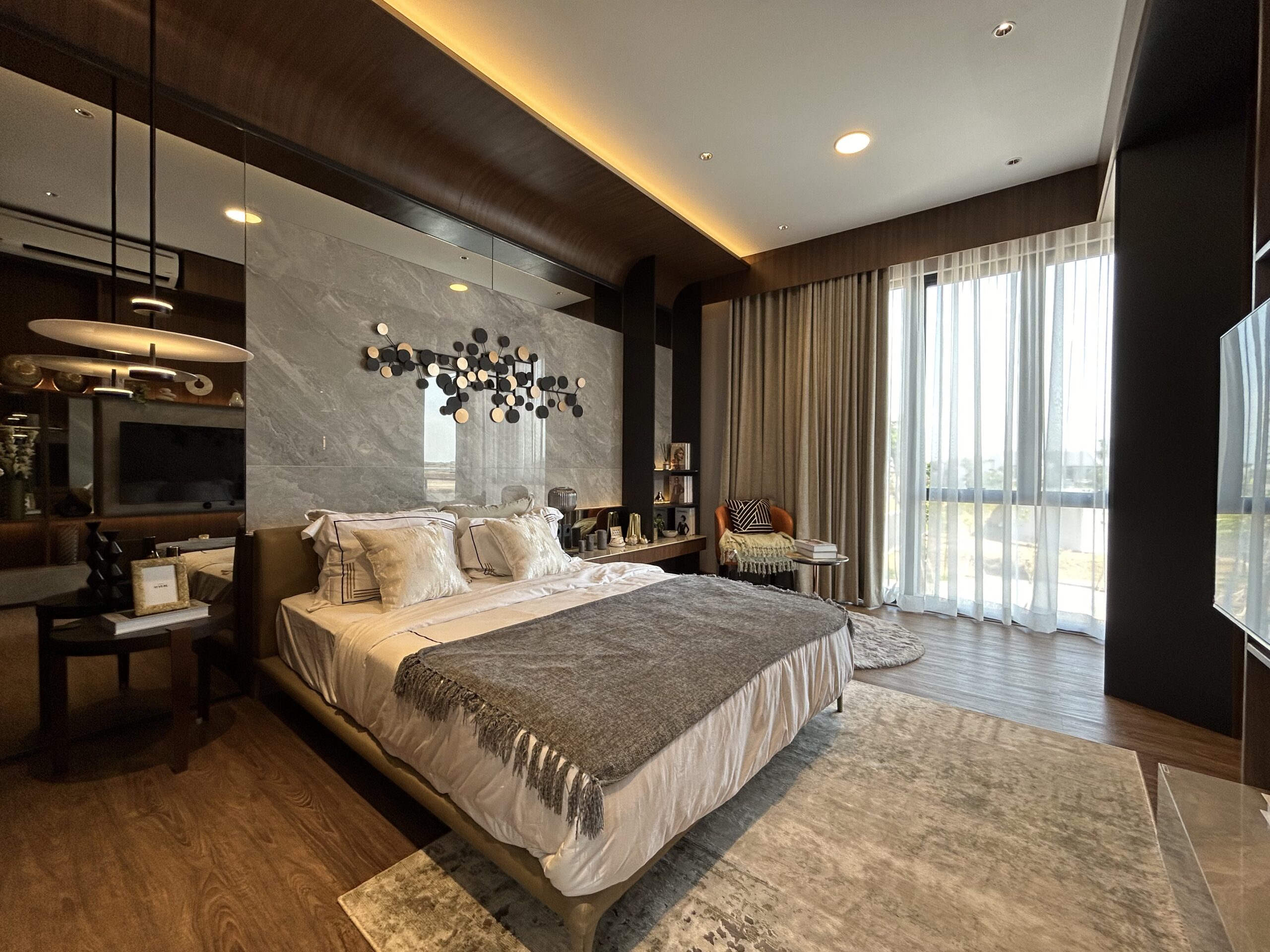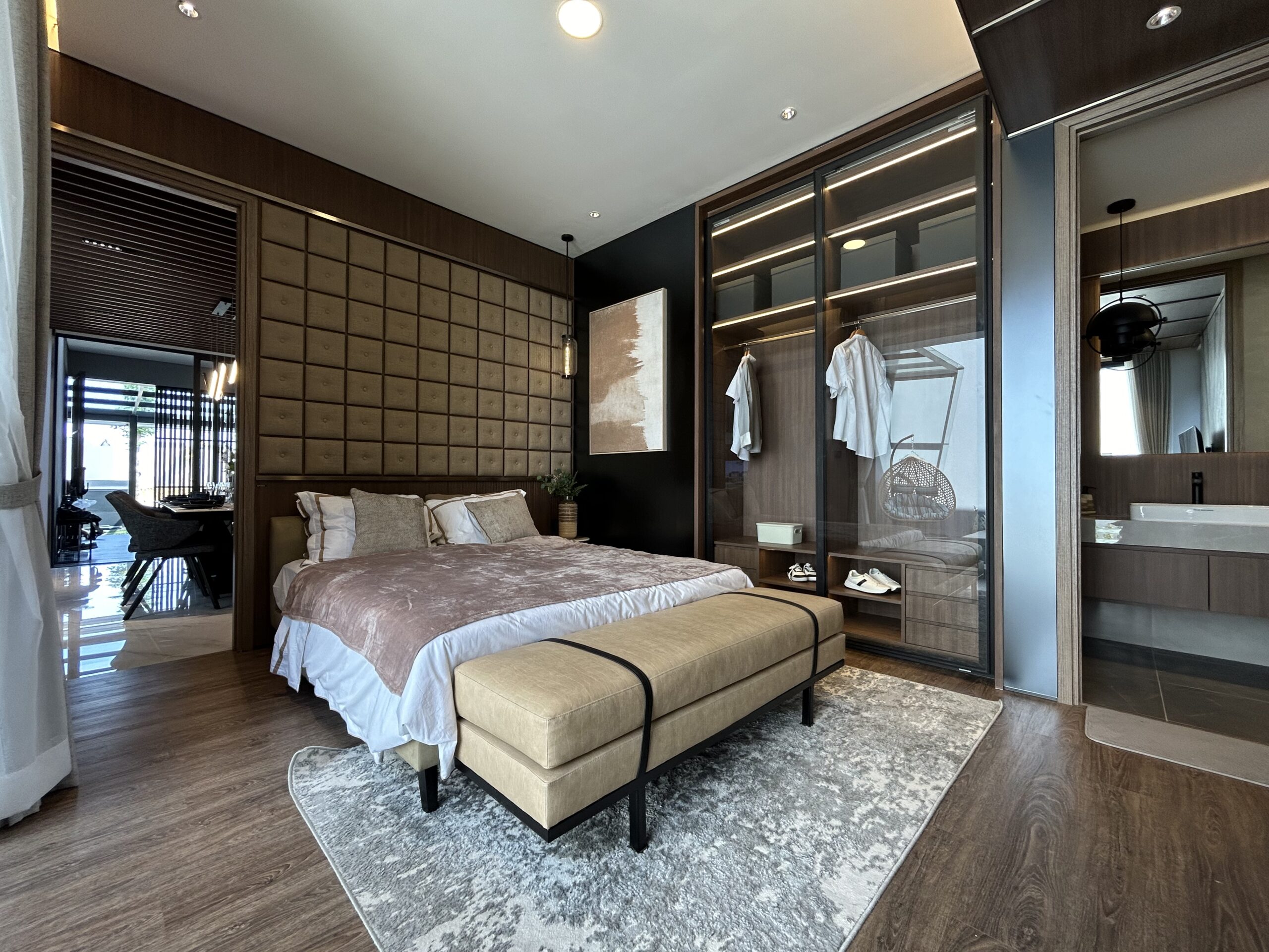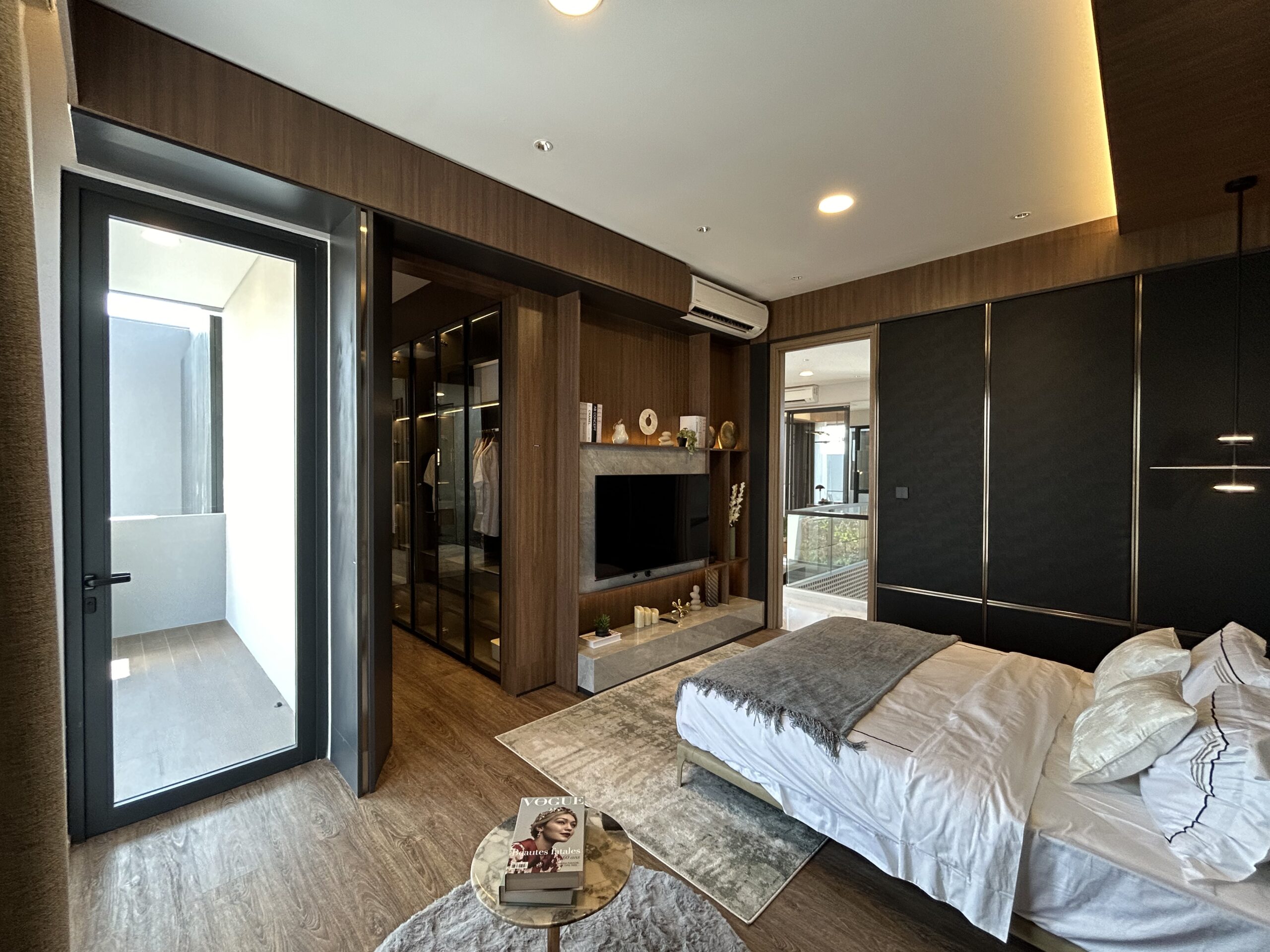 - Master bedroom mewah, dilengkapi walk-in closet, kamar mandi pribadi, dan balkon.